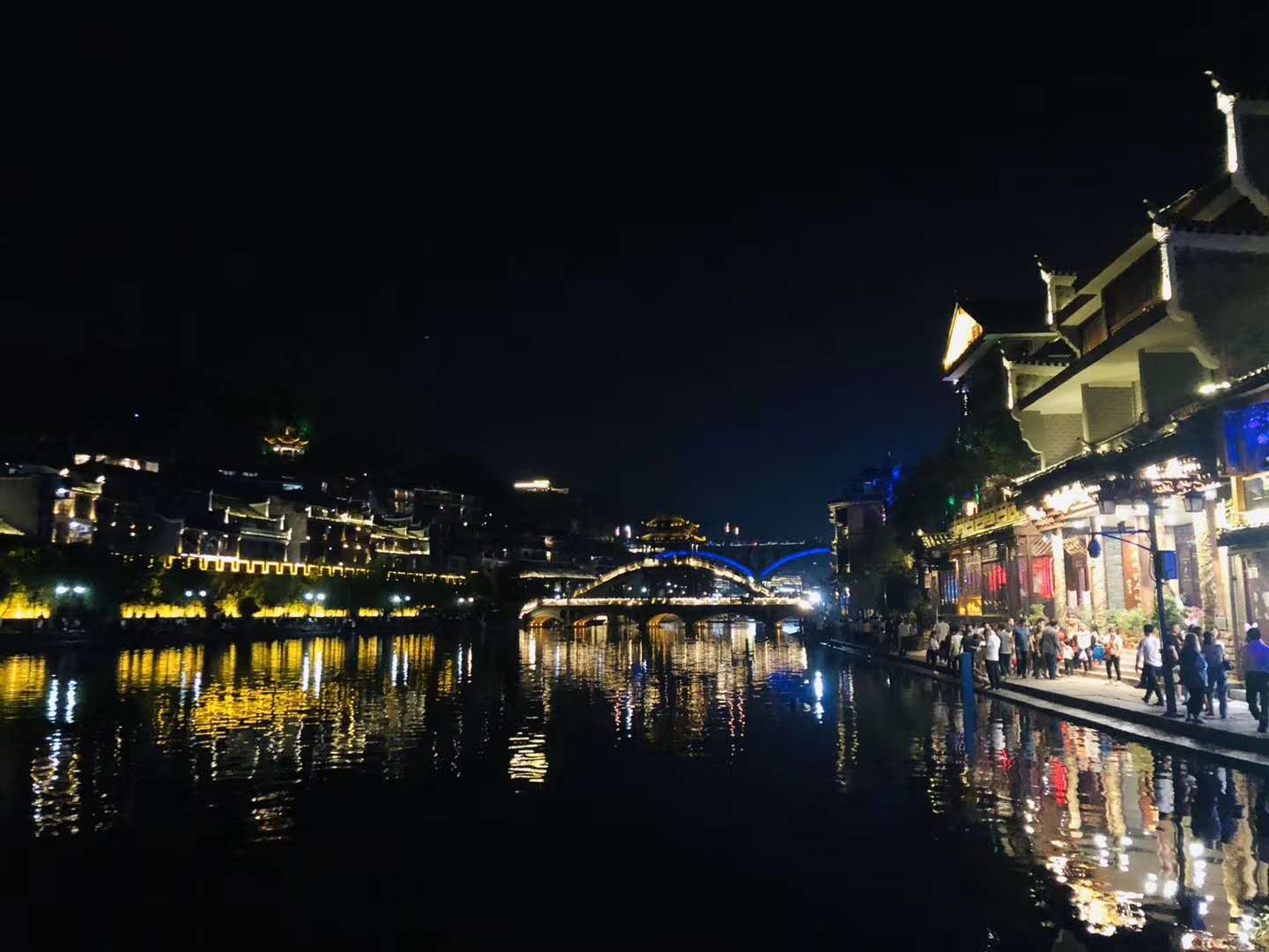 歷經十多個小時,小伙伴們終于到達了旅途的第一站,美麗的鳳凰古城。古香古色的風景,瞬間讓人忘記疲勞,月色下的古城也顯得格外愜意。